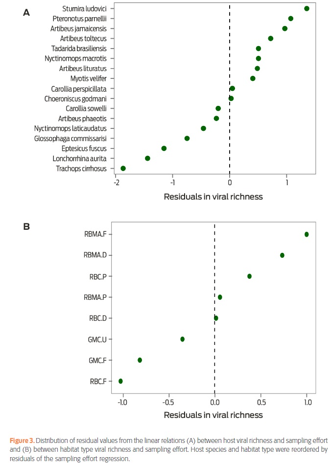 Positive relationships were observed between sampling effort and host viral richness (R2 = 0.44, p < 0.01) and between sampling effort and habitat type viral richness (R2 = 0.37 p < 0.05). Sturnira lilium, Pteronotus parnelli and Artibeus jamaicensis were associated with greater viral richness than expected by the linear model between host viral richness and sampling effort, whereas Trachops cirrhosus, Lonchorhina aurita and Eptesicus fuscus (Fig. 3.A), were identified as host species associated with lower viral richness than expected. The RBMA fragmented habitat type harbored the highest number of viruses compared to the expected value, while the RBC fragmented habitat type was identified as the site with the smallest viral richness compared to the value expected by the model (Fig. 3.B).