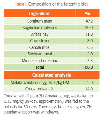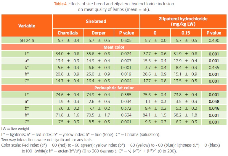 The effect of ZH on meat color has not been consistently shown. Different factors contribute to this inconsistency, such as final pH and temperature variation, and the combination of these 2 factors affects protein denaturation and color Sañudo et al., 1989). Some studies have found no effect of ZH on color variables (Avendaño et al., 2006; Romero, 2011), but results from Dávila et al. (2013) were similar to those of the present study. A possible explanation for the reduced lightness in the meat of ZH-treated sheep is the reduction in the amount of intramuscular fat (marbling), which is white in animals finished with totally mixed rations (Wulf and Wide, 1999).