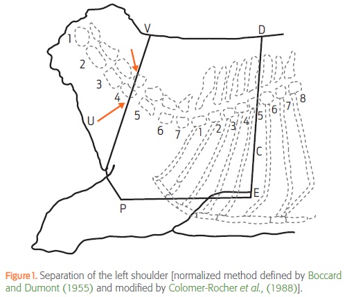 The left shoulder was separated from each carcass following the methodology of Vergara (2005), which involves a cut along the four lines shown in Fig. 1. Starting at point V, the cutting passes over the spinous apophysis of the 4th cervical vertebra (point U) across the neck, and then a cut to the tip of the chest (point P) must be done before continuing parallel to the ventral midline to point E, which is located between the 5th and 6th costochondral joints. The posterior boundary line (line D-E) runs perpendicular to the dorsal line and passes through point C between the 5th and 6th cervical vertebrae. The upper boundary is formed by the V-D line that runs over the backbone. The shoulders were vacuum-packaged and kept at -18 °C for further dissection.