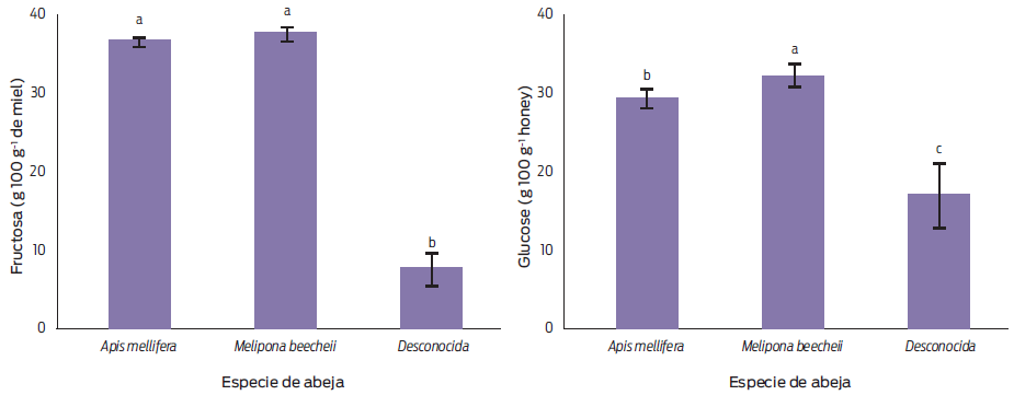 Figura 1 Concentración de fructosa y glucosa en miel de Apis mellifera, Melipona beecheii y producto comercializado como miel de abeja en el mercado local. Literales diferentes entre barras indican diferencias estadísticas significativas (P < 0.05).