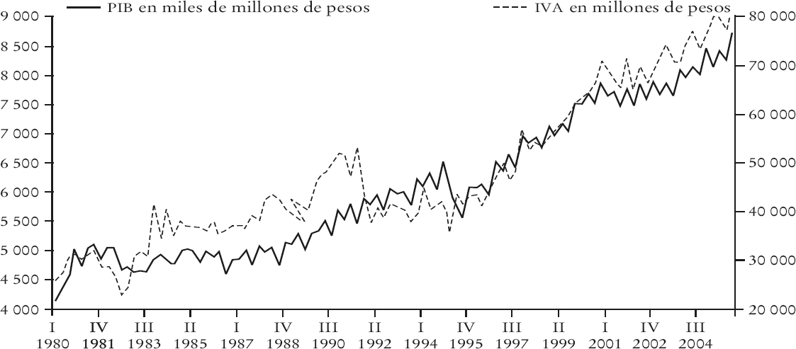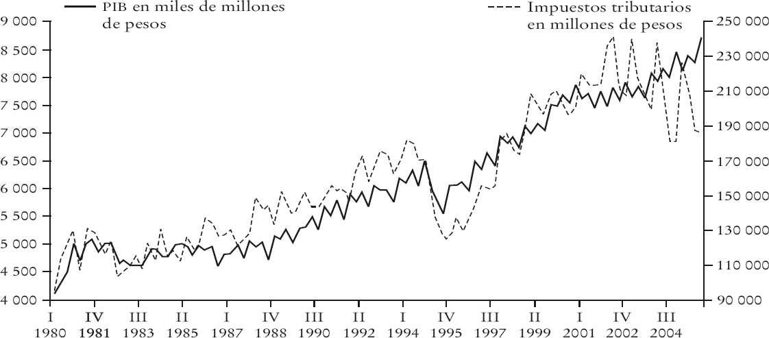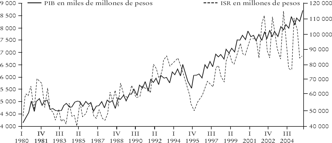 Durante el periodo 2001-2004 estos fondos constituyeron, en promedio, 43.4 y 64% del total de ingresos, sin deuda ni disponibilidades iniciales, de estados y municipios, respectivamente. Esto implica que las fluctuaciones de la RFP inciden de manera directa en 43.4 y 64% de las variaciones de los ingresos estatales y municipales, respectivamente.6 Durante el periodo que abarca este estudio —del primer trimestre de 1980 al segundo trimestre de 2005— el ISR, el IVA y el IEPS promediaron el 61% de RFP,7 entonces las fluctuaciones en estos ingresos tributarios repercuten en 26.5% de los ingresos estatales y en 39.1% de los ingresos municipales. De ahí la importancia de contar con un indicador que determine la sensibilidad de estos impuestos respecto al crecimiento económico.