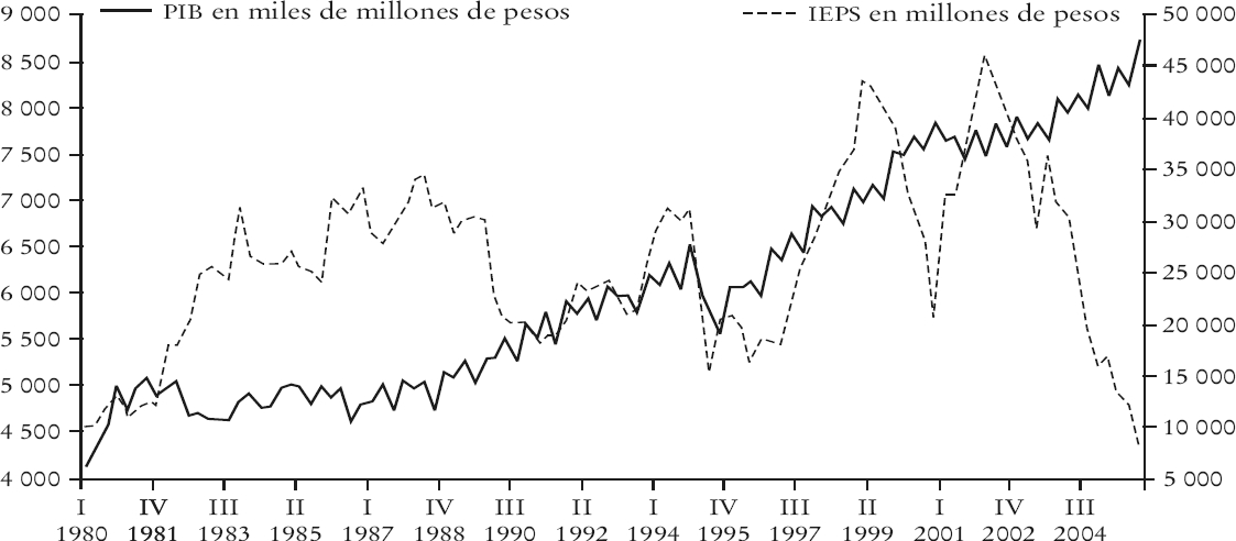 Las series de recaudación de ISR, IVA, IEPS y total de ingresos tributarios se obtuvieron de la Unidad de Política de Ingresos de la Secretaría de Hacienda y Crédito Público y del Banco de México y se agregaron trimestralmente. El PIB y su índice de precios implícito fueron obtenidos del Sistema de Cuentas Nacionales elaborado por el INEGI.8 Además, todos los valores se convirtieron a pesos de 2005. Las gráficas 1, 2, 3 y 4 muestran la evolución del PIB y de la recaudación de ISR, IVA, IEPS e ingreso tributarios.