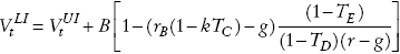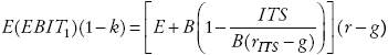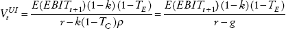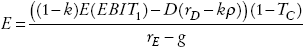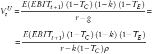 La empresa paga en cada año t dividendos de EBITt (1 − TC) (1 − k). Si r representa la tasa de rendimiento requerida de los flujos de caja después de impuestos que generan los activos de esta empresa en ausencia de deuda, el valor esperado en t para la empresa sin deuda en un sistema tributario clásico, considerando impuestos personales a una tasa TE , será: