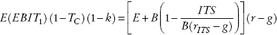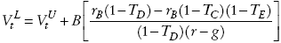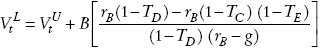 en las que B es el valor de mercado de la deuda actual (que puede diferir del valor nominal de la deuda D) y Tg denota el beneficio fiscal de la deuda como proporción de la misma. Esta expresión se simplifica si suponemos que no existen impuestos personales o más en general si la tasa de impuestos sobre los intereses de la deuda es igual a la tasa de impuestos sobre los dividendos, es decir si TD = TE , en cuyo caso el beneficio fiscal de la deuda se simplifica a: