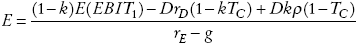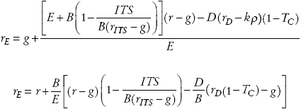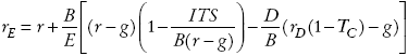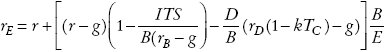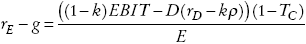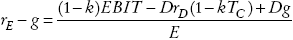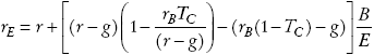 La intuición de este resultado es que la deuda proporciona escudos fiscales a nivel corporativo en el periodo t por kTCrDD(1 + g)t-1. Utilizando la ecuación (A4) del Apéndice, la tasa de rendimiento exigida al patrimonio es representada por: