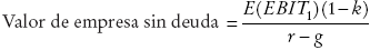 Considérese una empresa sin deuda que hace una inversión inicial en t = 0 de I, la que a su vez genera una tasa de rendimiento esperado de la inversión de ρ por periodo, y por ende un flujo de caja perpetuo esperado de E(EBIT1) = Iρ antes de impuestos corporativos.5 Se debe destacar que el flujo de caja EBIT1 es una variable aleatoria. La inversión se financia enteramente con recursos propios. Como en el modelo de Gordon y Shapiro, cada año t la empresa reinvierte una fracción k de sus flujos de caja después de impuestos, k EBITt (1 - TC), y obtiene por ella el mismo rendimiento esperado de ρ en los siguientes periodos, de modo que la ganancia esperada antes de impuestos del año siguiente será E(EBITt+1) = E(EBITt) [1 + k(1 − TC)ρ]. Es decir, cada año las operaciones generan flujos de caja esperados iguales a los flujos esperados del año anterior, más el rendimiento esperado de la inversión del año anterior. Esto implica que las utilidades, los dividendos y la inversión en activos crecen a la misma tasa esperada g = k(1 − TC) ρ. Así, la tasa de crecimiento esperada es el producto de la fracción de las utilidades después de impuestos corporativos que es invertida en la empresa, k(1 − TC), y el rendimiento esperado de esa inversión, ρ.6 Nótese en esta ecuación que los impuestos corporativos afectan negativamente la tasa de crecimiento de las utilidades, de los dividendos y de los activos.