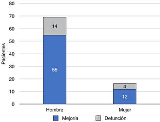 estándar (DE) de 16.3; 55 fueron hombres (79%) y 12 fueron mujeres (75%). Además, el