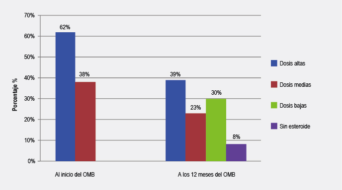 El 62 % (38) de los pacientes tenía dosis de ICS alta y 38 % (23), dosis media; 92 % (56) recibía antileucotrieno y 97 % (59), β2 de larga acción. Solo un paciente tomaba esteroide sistémico continuo; 49 % (30) recibió ciclos cortos (entre tres y cinco días) de esteroide oral por exacerbaciones en el año anterior al inicio de OMB; 47 % (14) de los pacientes recibió más de seis ciclos y 42.6 % (26), inmunoterapia contra ácaros.