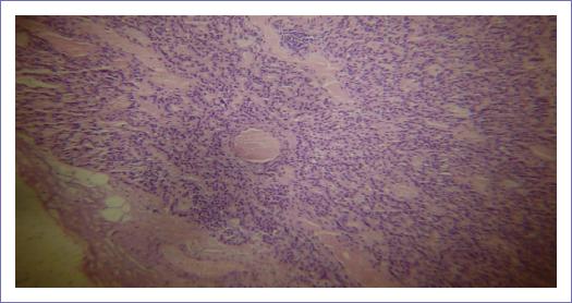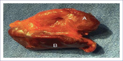 Paciente de sexo femenino de 33 años de edad, antecedentes quirúrgicos de plastia umbilical y colecistectomía laparoscópica, asintomática, debutó con cuadro de pancreatitis aguda secundario a hipercalcemia, diagnosticada con hiperparatiroidismo secundario. Se inició protocolo de estudio. El ultrasonido reportó glándula tiroides: lóbulo derecho 3.1 x 1.3 x 1.2 cm, lóbulo izquierdo 3 x 1.1 x 1.4 cm, ecogenicidad interna homogénea e imagen nodular hipoecogénica de 1.7 x 1.4 x 1.9 cm. Tomografía de cuello: aumento de tamaño de lóbulo izquierdo, desplaza a estructuras vecinas (Fig. 1). Fue tratada con cinacalcet, con adecuada respuesta. Programada para cirugía con laboratorios preoperatorios: hormona paratiroidea (PTH) 1,258, calcio 15.72, fósforo 1.56, albúmina 4.47. Fue tratada con cinacalcet, con adecuada respuesta. Programada para cirugía, se realizó hemitiroidectomía izquierda con paratiroidectomía izquierda (Figs. 2 y 3). Laboratorios postoperatorios: PTH 60.4, calcio 10.53, fósforo 2.55, albúmina 4.04. Patología: carcinoma de paratiroides con invasión a cápsula y tejidos vecinos, tumor de 3.5 x 3 cm. Histología: tinción con hematoxilina-eosina 40x. Células principales en cordones invadiendo la cápsula, existiendo homogeneidad en las formas y tamaños celulares (Fig. 4).