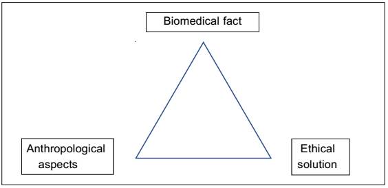 The triangle must be understood in two dimensions. On the one hand, a static dimension represented by its vertices, which show the components of any bioethical analysis. These components must be present simultaneously, in an analogous way to how the triangle only takes shape when the three vertices are simultaneously present. The reality being analyzed is seen in an interdisciplinary prism, where moral reality converges or is configured thanks to the joint perspective of law and empirical data, such as the cases of medicine (or clinical bioethics), social and individual realities, etc. On the other hand, the triangle suggests a dynamic vision of ethical judgment, in which, from an anthropology, some principles are obtained that serve to interpret the facts that give us the clue of the correct action to be taken in the concrete case. Nevertheless, at the same time, we have to start from the concrete case, submit it to the anthropological sieve to discover the values at stake, and again contrast it with the empirical reality of the respective sciences.