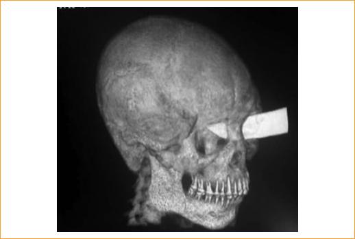 Figura 1 Vista frontal del paciente. Lesión de la órbita izquierda. Cuerpo extraño reconocido como un cuchillo.