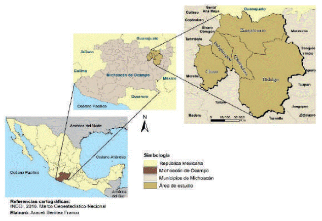 Los municipios de Charo, Hidalgo, Indaparapeo, Queréndaro y Zinapécuaro, área de estudio, están ubicados en la parte noreste del estado de Michoacán, México (Figura 1), tienen en conjunto una superficie de 2,457 km2, la cual ocupa el 4.21 % de la superficie del estado de Michoacán (INEGI, 2013).