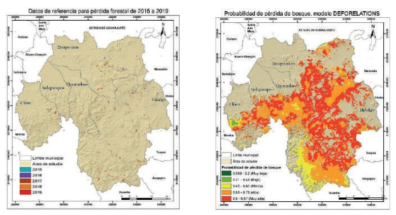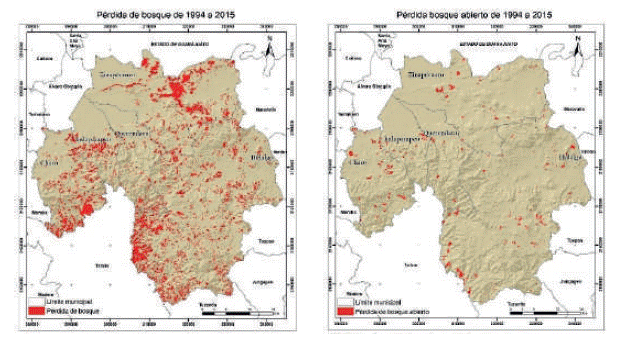 En el análisis de los resultados en relación con la pérdida forestal, se identifica que, en estos años, el cambio de uso de suelo fue el principal factor que detonó la disminución del bosque, y en algunas zonas este comenzará también a ser bosque abierto. Principalmente, la ubicación de nuevos asentamientos es uno de los factores que detonan la proliferación de otros usos suelo como son los cultivos y caminos nuevos para tener accesibilidad a otras poblaciones o actividades económicas. La pérdida de bosque en mayores proporciones se presenta en los municipios de Zinapécuaro e Hidalgo.