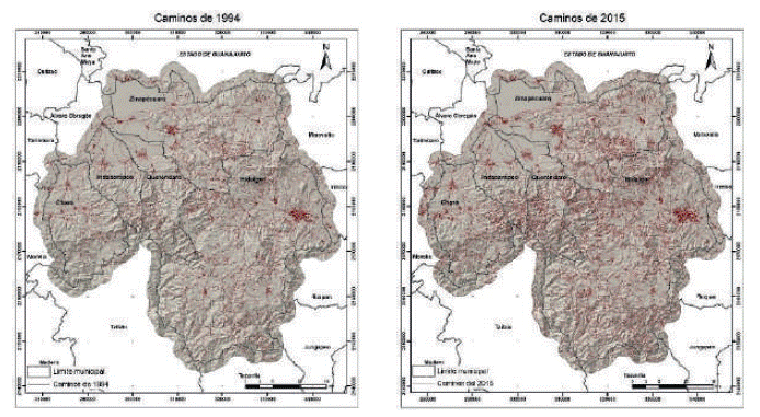 En el área de estudio, los caminos en el año de 1994 tenían una longitud de 7,046.39 km, y para el 2015 fue de 11,520.28 km lineales, lo cual representa un incremento de un 63% (4,473 km). Lo que respecta a los cambios en las cubiertas y uso de suelo en la Tabla 1 se aprecia que en el año 2015 el bosque disminuye en superficie un 17% de lo que se tenía en 1994, ya que en algunos el cambio fue de bosque a asentamientos humanos, además que esto dio paso al incremento de bosque abierto.