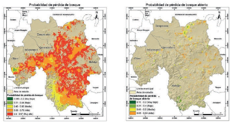 En esta fase se tomaron las funciones matemáticas anteriormente definidas para ejecutarlas en un SIG y así obtener la probabilidad de pérdida de forestal en los municipios de Charo, Hidalgo, Indaparapeo, Queréndaro y Zinapécuaro. Esto se realizó con cada uno de los parámetros de manera individual para observar claramente cómo influye cada uno de ellos en la probabilidad de pérdida de bosque y bosque abierto. Para facilitar la interpretación de los mapas los valores resultantes se reclasificaron en rangos de probabilidad.