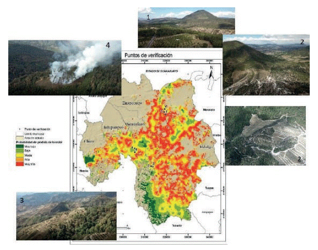 En febrero del 2020 se realizó una salida con algunos puntos de verificación, solo para tener una idea aproximada de si en los últimos cinco años se tuviera algún cambio importante en la cubierta forestal no observado previamente durante el período estudiado. La toma de fotografías en los puntos de verificación se hizo con un dron. En la Figura 9 se aprecian los puntos de verificación. En el punto 1 (parte sur de Zinapécuaro) se observa la presencia de cultivos permanentes en este caso el aguacate, además de que ya se comienzan a apreciar partes con deforestación y caminos nuevos para ingresar a la zona del bosque, justamente se aprecia el patrón de que los pobladores ingresan en las partes altas del bosque sin ninguna limitante en altitud del terreno. En el punto 2, nuevamente se presenta los cultivos de aguacate y caminos y se distingue la pendiente del terreno no es una limitante para la inserción de cultivos. En la zona sur de Queréndaro (punto 3) se apreció que también cultivos de aguacate y se observa porque no hay un conocimiento de que orientación de las laderas son más favorables para los cultivos permanentes. Por último, en el punto 4 se aprecia un incendio justo para cambiar el uso del suelo en esa zona.