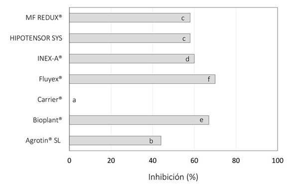 En cuanto a los coadyuvantes, Carrier® no inhibió el crecimiento micelial de T. koningiopsis Th003, mientras que los restantes lo hicieron entre un 44 y 70%, siendo en Fluyex® donde se observó la mayor inhibición (Figura 3).
