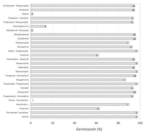 Efecto de los agroquímicos sobre la germinación de los conidios de T. koningiopsis Th003. En presencia de Dodine, Metalaxil-M - Mancozeb y Thiram - Pirimetanil la germinación de los conidios fue inhibida totalmente, mientras que Iminoctadine Tris (Albesilate) solo la permitió en un 14% y Fluazinam y Plocloraz en un 63% (Figura 4). Entre tanto, en presencia de los demás fungicidas la germinación de los conidios fue ≥ 87%, 13 de ellos sin presentar diferencias significativas con respecto al control.
