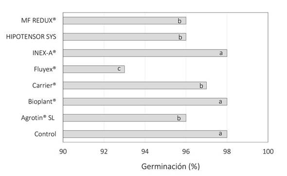 Figura 6 Germinación de conidios de T. koningiopsis Th003 en exposición a soluciones de coadyuvantes. Columnas con la misma letra no son significativamente diferentes de acuerdo con la prueba de Fisher LSD (*= P>0.05).