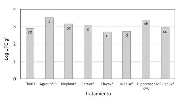 Efecto de los coadyuvantes en el establecimiento de T. koningiopsis Th003 en la filosfera. Las mayores poblaciones de T. koningiopsis Th003 se recuperaron en los tratamientos correspondientes a Agrotin® SL e HIPOTENSOR con medias de 3.5 y 3.3 log (UFC g-1) respectivamente, presentando diferencias significativas con los demás tratamientos. El control presentó una media de 2.9 log (UFC g-1) y junto a Fluyex® e INEX-A® con medias de 2.7 log (UFC g-1) presentaron los menores valores para las poblaciones recuperadas del hongo (Figura 7).