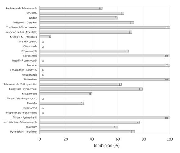 Al exponer el hongo en presencia del medio con Flutriafol, Kasugamicina y Fenhexamid - Tebuconazol la inhibición de su crecimiento estuvo entre el 34 y 48%, mientras que al exponerse a Azoxistrobina - Difenoconazole, Dodine, Fluazinam, Fludioxonil - Ciprodinil, Pyrimethanil - Iprodione, Iminoctadine Tris (Albesilate), Himexazol, Propiconazole y Tebuconazole - Trifloxystrobin la inhibición del crecimiento micelial estuvo entre un 60 y 79% (Figura 1). Entre tanto, en presencia de Thiram - Pirimetanil, Procloraz, Tiabendazol, Spiroxamina y Triadimenol -Tebuconazole el crecimiento de T. koningiopsis Th003 fue inhibido totalmente (Figura 1).