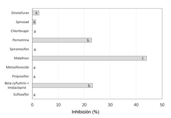 Con respecto a los insecticidas, solo en presencia de Beta-Cyuthrin - lmidacloprid Permetrina (inhibición del 23%) y Malathion (inhibición del 44%) se observó reducción del crecimiento del hongo, siendo a su vez los únicos insecticidas que presentaron diferencias significativas con respecto al control (Figura 2).