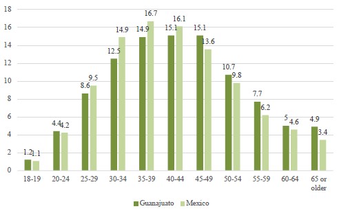 Graph 2 shows another basic variable that outlines the profile of the Guanajuato voter abroad. When comparing the age of Guanajuatenses with the national average of foreign voters in the 2018 election, the first presents a similar behavior, but two nuances can be noticed: the first is that the average of Guanajuato voters in the age range of 18 to 44 years is below the national percentage; Guanajuato voters aged 45 and over residing abroad voted more, compared to national voters. Although it must also be said that the percentage differences are small.