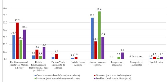 This article analyzes the vote cast from abroad to elect president in Mexico and state governor of Guanajuato, specifically by citizens whose birthplace is Guanajuato. This case study is relevant for several reasons. In the first place, it is the first time that emigrants from Guanajuato can vote to elect their governor and senators; secondly, because Guanajuato is one of the entities with the greatest migratory dynamism in Mexico in terms of emigrants, returnees and remittances; thirdly, it was the only state in which the vote of state residents did not favor AMLO; on the contrary, with a tradition of more than 25 years of governments from the National Action Party (PAN, acronym in Spanish for Partido Acción Nacional), the majority of the votes for presidential election were for candidate Ricardo Anaya from the Mexico First (Por México al Frente) coalition, formed in turn by the PAN, the Democratic Revolution Party (PRD, acronym in Spanish for Partido de la Revolución Democrática) and the Citizen Movement Party (PMC, acronym in Spanish for Partido Movimiento Ciudadano). However, things were different for the vote to elect governor, since Ricardo Scheffield Padilla, the candidate by the Together We Will Make History coalition, made up of Morena, the Labor Party (PT, acronym in Spanish for Partido del Trabajo) and the Social Coalition Party (PES, acronym in Spanish for Partido Encuentro Social), obtained the majority of votes from abroad, more than 56 percent of all votes received from abroad (4 826).