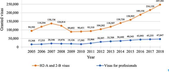 The peak in cases of undocumented Mexicans crossing the northern (Mexico-U.S.) border was reached in 2007, which later fell almost brutally in a few years. Such rapid decline was explained on grounds of the economic crisis of 2007-2009, however, as the crisis diminished, these undocumented migration flows were not seen again at the same scale; yet by 2013 and the years that followed, the new dominant pattern of Mexican migration to the United States was that of documented temporary flows that, first being few, were growing in intensity, focusing mainly on agriculture and services, and then the lesser professional flows, in this case both with temporary and resident visas. These changes were unprecedented and unexpected, and also different from those of the past due to their legal status. In this regard, we must remember the strong obstacles and deterrents by the U.S. government to even think about the possibility of agreements on legal migration from Mexico. In reality, what has happened lately has taken place in a somewhat surreptitious way, as part of a dynamic of labor supply and demand that has been occurring between the two countries in recent years, but without being clearly seen by the two governments, in such a way that now it is surprising that there is such an intense legal Mexican migration, taking place before an apparent government silence from both countries.