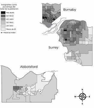 Mapa 2 Distribución de inmigrantes como un porcentaje de la población total en Burnaby, Surrey y Abbotsford