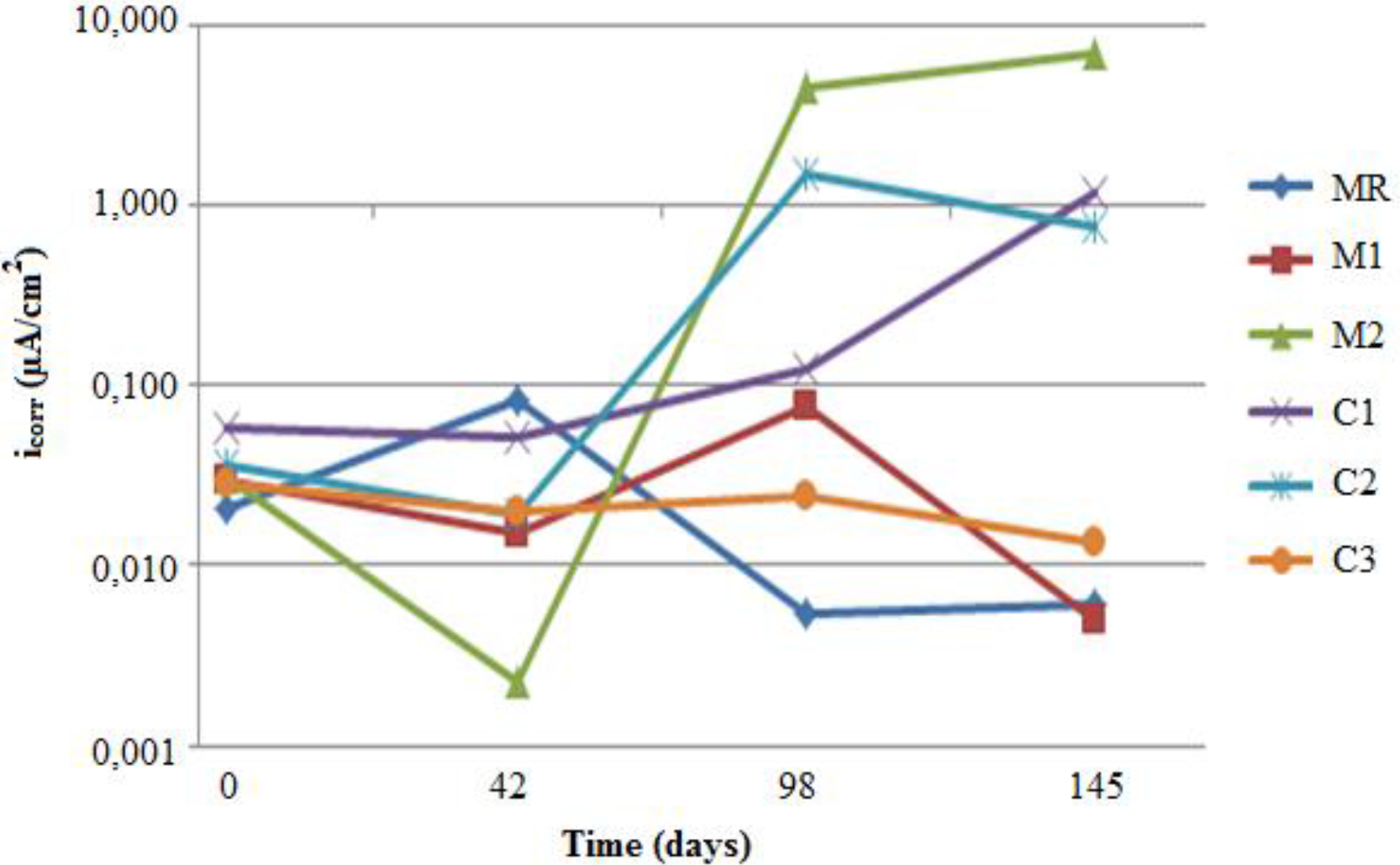 The evolution of icorr during the carbonation process is shown in Figure 5. From this, it is possible to say that, at the start, the values of icorr at first age show passivity in the reinforced steel (lower than 0.1 μA/cm2) in all mortars. However, as Ecorr indicates, for the steel within mortars M2, C1, and C2 depassivation occurs after 42 days.