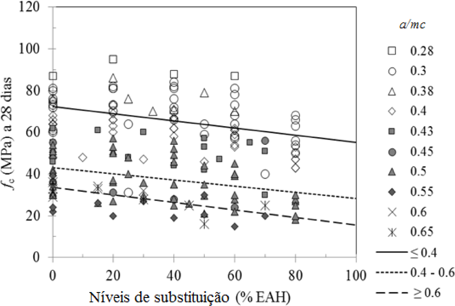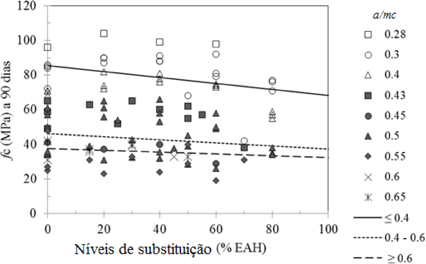 Nas Figuras 2 e 3 estão apresentados graficamente os dados mostrados na Tabela 2, correspondentes à resistência à compressão real do concreto na idade de 28 dias (Figura 2) e 90 dias (Figura 3), dependendo do nível de substituição de cimento. Também nas Figuras 2 e 3 estão apresentadas as linhas de correlação média com a classificação em intervalos da relação a/mc; os valores menores que 0,4, o intervalo entre 0,4 e 0,6, e valores superiores a 0,6.