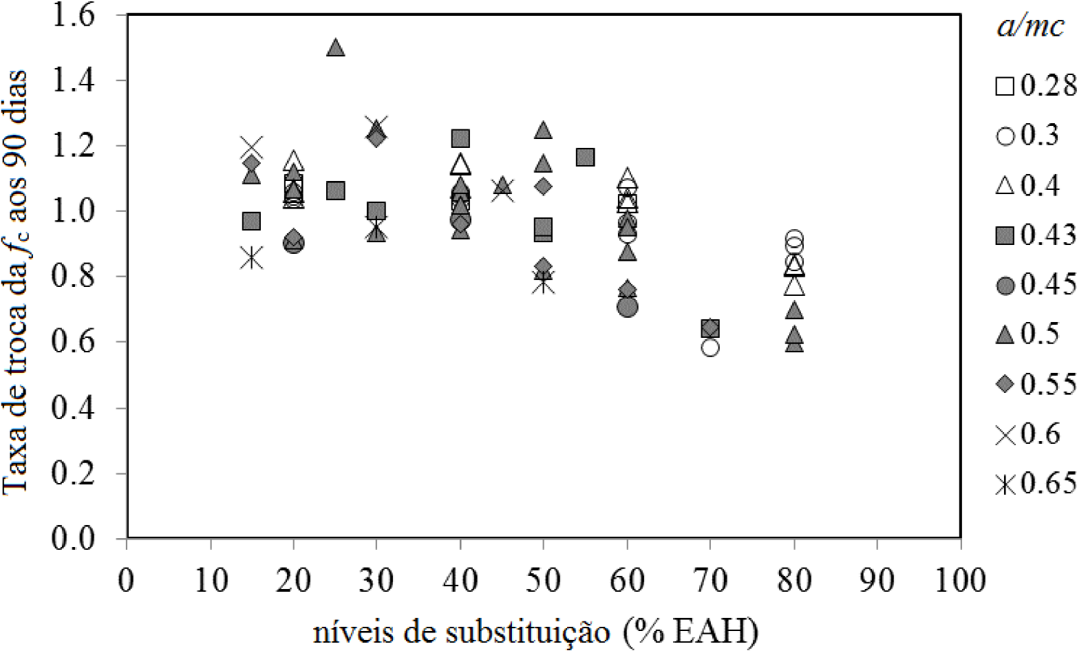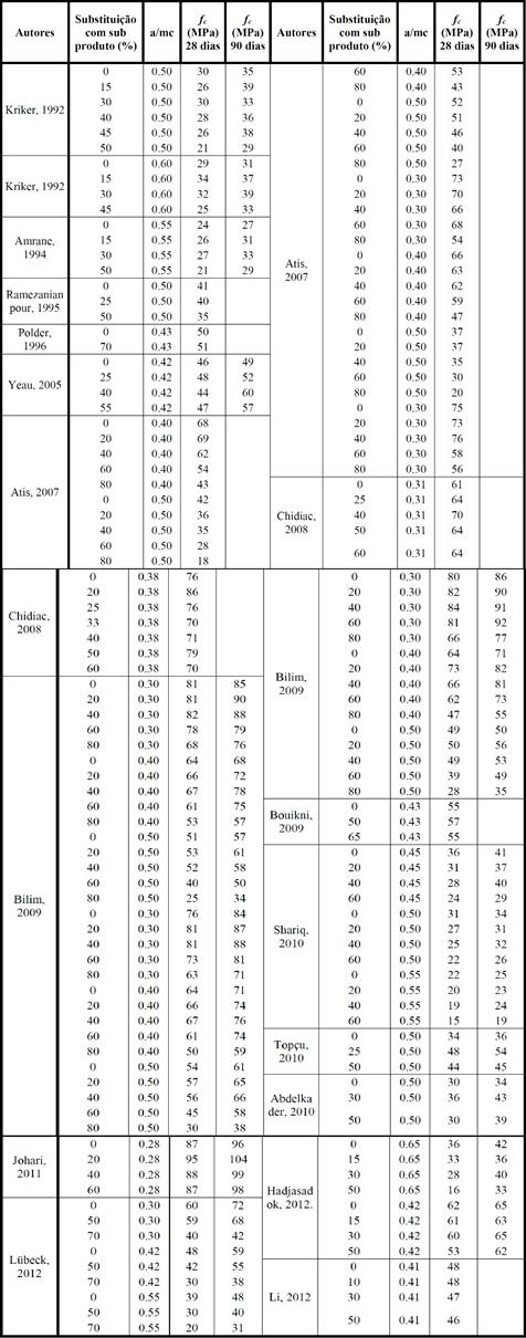 Na Tabela 2 são apresentados alguns resultados relatados na literatura sobre a resistência à compressão real f c do concreto nas idades de 28 e 90 dias, contendo substituições de cimento portland comum tipo I pelo subproduto de EAF. Na tabela são mencionados o nível de substituição, a relação a/mc e resistência à compressão aos 28 e 90 dias.