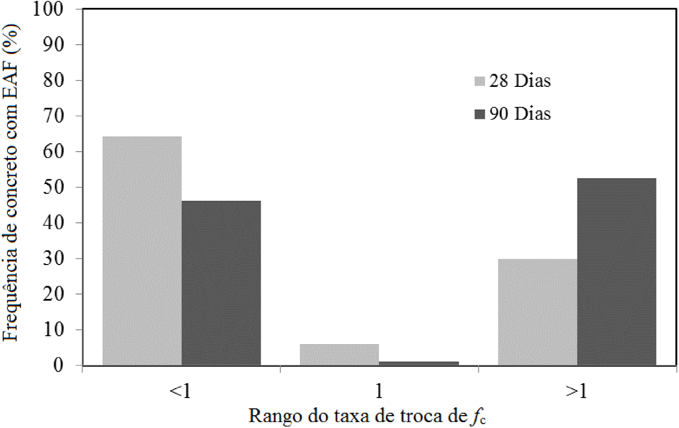 Para se observar o efeito causado pela escória no concreto endurecido com o passar do tempo, foi determinada a frequência da mudança na resistência do concreto de acordo com três faixas de taxa de troca: os concretos com EAF que apresentaram uma alteração <1 com relação ao concreto de referência; aqueles sem qualquer alteração ou taxa de variação, que foram considerados iguais a 1; e aqueles que tiveram alterações> 1, para ambas as idades de concreto. Isto é mostrado na Figura 6, através de um gráfico de uma amostra representativa dos dados de resistência de concreto com escória analisados neste trabalho e que geraram taxas de troca de f c menores, iguais e maior do que 1. A figura 6 mostra claramente que para a taxa de troca <1 há uma diminuição na frequência da taxa de troca para o concreto com EAF passando de 28 para 90 dias de idade, enquanto para a taxa de troca> 1, há um aumento da frequência. Isto significa que o impacto sobre a taxa de troca com os valores <1 para concretos com EAF aos 28 dias é maior do que para o concreto de referência. Enquanto os valores da taxa de troca> 1, que representam os concretos com EAF e superam a resistência do concreto de referência, têm o maior impacto sobre a taxa de troca os concretos com 90 dias de idade. Isto está relacionado com exposto anteriormente, enquanto a escória tem um processo de hidratação mais lento do que o CPC, o que requer um tempo mais longo para alcançar a hidratação ótima e, portanto, desenvolver compostos e fases quimicamente mais estáveis, que resultam em melhoria da resistência à compressão do concreto. Isto posto, acredita-se que estas características de hidratação são um fator condicionante para o desenvolvimento da resistência e que interfere na diminuição da resistência, além do tipo de atividade da escória e cura aplicada no concreto.