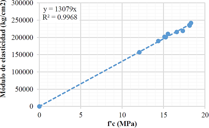 Con el objetivo de hacer una similitud con la fórmula de las NTC- RCDF, se determinó la función de K del ME obtenido en la experimentación, con una regresión lineal ajustada en el programa de Microsoft Excel, considerando que para una f’c= 0, se obtendría un ME con valor de 0 (Figura 6). La ecuación obtenida con la regresión lineal fue: