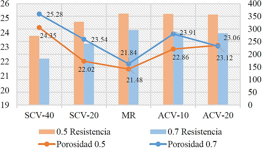 Se determinó la RC, ME y porosidad de acuerdo a las normas ASTM correspondientes.