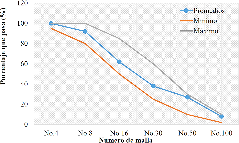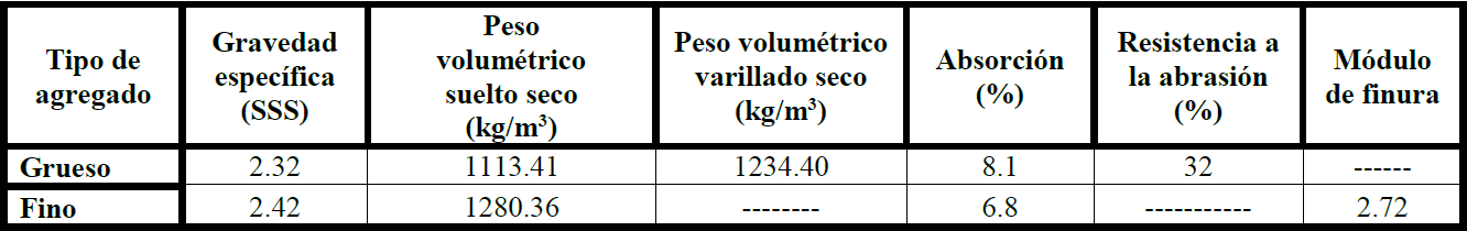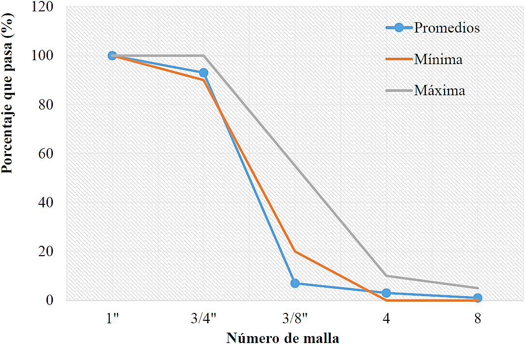 En la Tabla 3 se presenta la caracterización física de los agregados grueso y fino: Peso volumétrico, densidad, absorción, resistencia a la abrasión y módulo de finura. Los valores presentados son el promedio de 3 muestras. En las Figuras 1 y 2 se presentan las granulometrías del agregado grueso y el agregado fino. Se puede observar que solo el agregado fino llega a los estándares especificados por las normas ASTM C33.
