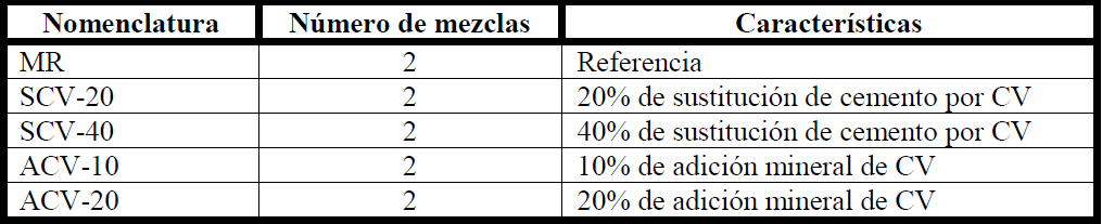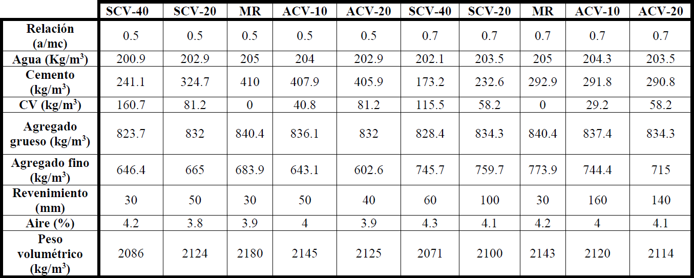 La inclusión de la CV como material cementante (Mezclas SCV-20 y SCV-40, Tabla 1) y como aditivo mineral (Mezclas ACV-10 y ACV-20), incluyéndola en el volumen de la mezcla usando su densidad. En el caso de las mezclas adicionadas de CV, se reemplazó porcentaje de agregado fino por CV en el diseño.