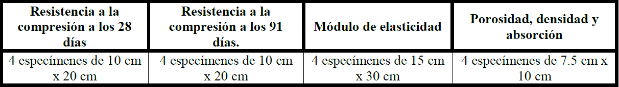 Los especímenes deberán ser fabricados con Cemento Portland Compuesto 30R y CV Clase F.