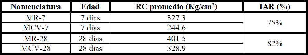 Por último, la norma ASTM C 618 nos indica que la CV clase F deberá tener un IAR mínimo a los 7 o 28 días de 75% para que pueda ser considerado su uso en el concreto. En la Tabla 5 se presentan los resultados.