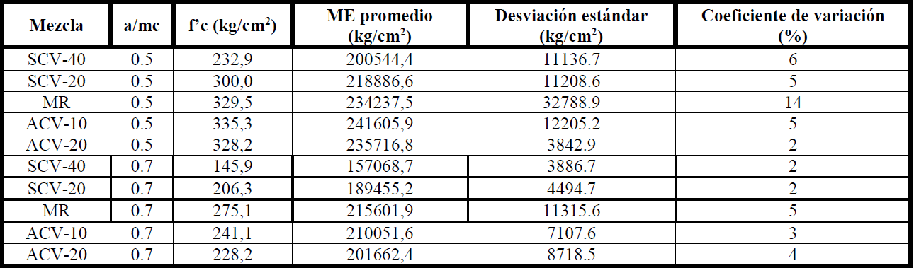 Con el fin de tener un punto de comparación, se determinó el ME de cada mezcla con las formulas propuestas por las Normas Técnicas Complementarias del Reglamento de Construcción del Distrito Federal (NTC RDF) para concreto clase 2 y peso volumétrico menor a 2200 kg/m3 (ecuación 2), las normas de diseño del ACI 318 para concretos con peso volumétrico entre 1440 kg/m3 y 2480 kg/m3 (ecuación 3) y una investigación realizada en la Facultad de Ingeniería de la Universidad Autónoma de Yucatán (FIUADY) por Hernández en el 2013 donde establece una relación entre las densidades de los agregados y la raíz cuadrada de la RC para predecir el ME en concretos con ACTAA, (ecuación 4). La comparación de los resultados se encuentra en la Tabla 11.