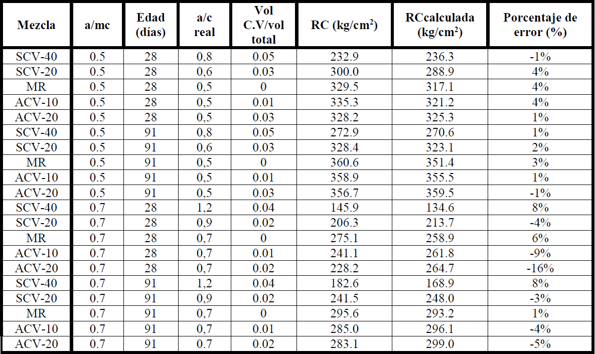 Donde: ƒ’ c = RC en kg/cm2, Edad= Edad del concreto en días, a/c = Relación a/c real, Vol. C.V. /m3 = Relación de volumen de CV por m3.
