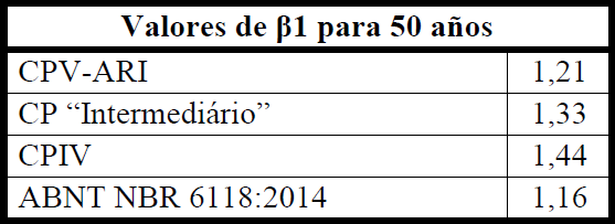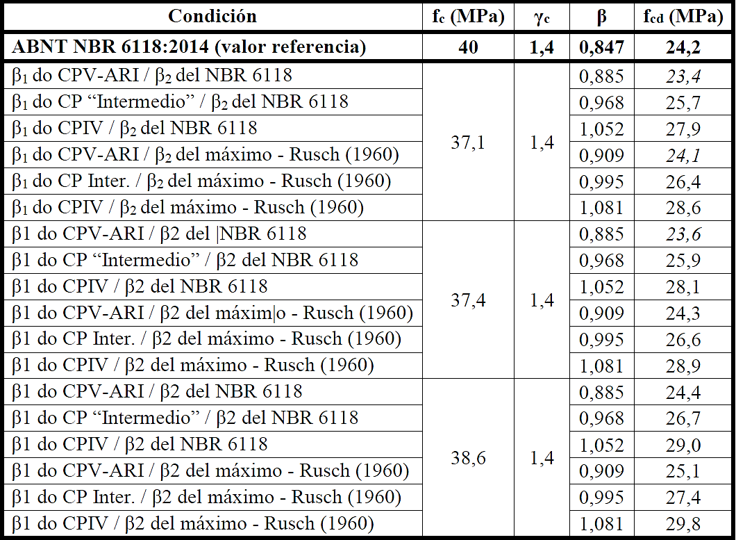 Se estima que la norma brasileña, ABNT NBR 6118:2014, establece valores de 1,16 para β1 y 0,73 para β2, considerando valores de carga desde los 28 días hasta 50 años, resultando en un β de 0,85. Se observa que los valores utilizados son conservadores, visto que admite un desarrollo de resistencia de apenas 16% en un período de 50 años y un valor de decremento mayor que el máximo establecido por Rüsch (1960) (Helene, 2011). De este modo, se vuelve adecuado verificar los valores de β1 y β2, considerando la fórmula propuesta por el fib Model Code 2010 (CEB, 2012) y las consideraciones hechas por Rüsch (1960).