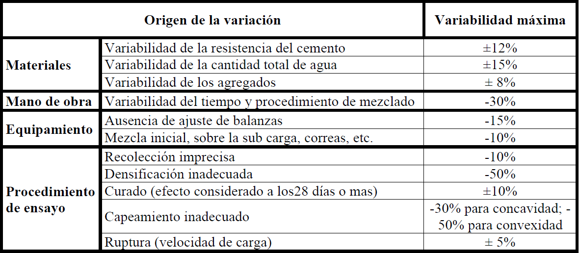 Otro factor a ser verificado es la variabilidad de los resultados del ensayo de resistencia a compresión. Magalhaes (2014) resalta que todas las etapas de la producción del concreto llevan a la dispersión de los resultados del control tecnológico, siendo que estos pueden ser separados en tres diferentes aspectos: influencia de los materiales, de los mecanismos de producción y del procedimiento de ensayo. La Tabla 1 presenta los principales factores que pueden influenciar el resultado de la resistencia a compresión del concreto, así como la variabilidad máxima del item.