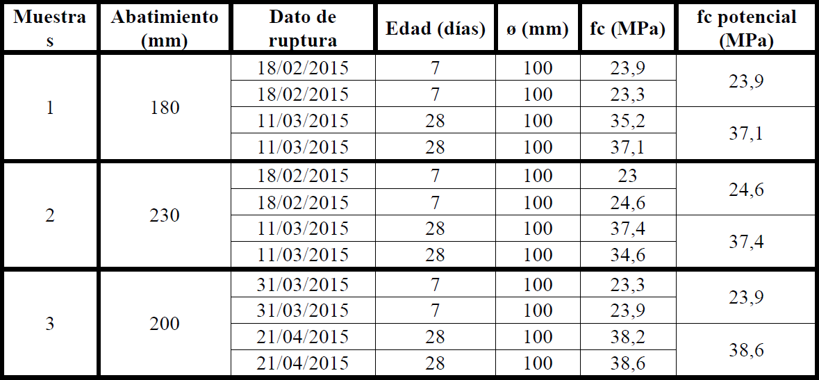 En los datos especificadas de ensayo, se realizaron los ensayos, en laboratorio acreditado, siguiendo los procedimientos normativos. Todos los núcleos fueron nivelados y los ensayos se realizaron en la prensa máquina universal EMIC - PC 200 CS. Los resultados son presentados en la Tabla 3.