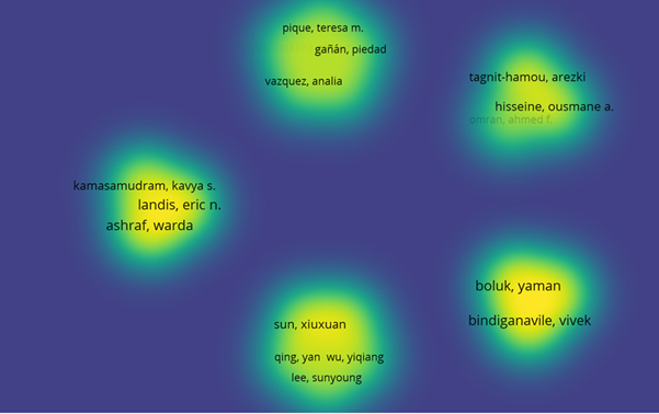 Los autores que más publicaron sobre el tema se muestran en la Figura 2, donde los colores claros (amarillo) indican mayor número de trabajos publicados, diferenciados por grupos de autores. Se observó que algunos autores participaron en más de una publicación sobre el tema. Mientras que, el 70% de los estudios presentaron autores diferentes. Este análisis muestra que existe un alto interés en la incorporación de NFC en matrices de cemento ya que varias instituciones y varios autores están involucrados en estas investigaciones.