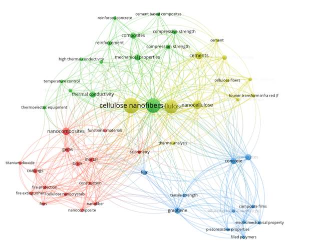 La Figura 3 presenta las palabras más utilizadas en los títulos y palabras clave de los artículos estudiados. De acuerdo con los datos recabados, se percibe un predominio de las palabras "cellulose nanofibers", además de la presencia de propiedades que los artículos analizaron, entre ellas, "mechanical properties" y "compressive strength", es claro que existe una gran variedad de enfoques que se están utilizando en la actualidad con respecto al uso de NFC, lo que indica el rango de ventajas que este material puede presentar cuando se incorpora a diferentes tipos de matrices.
