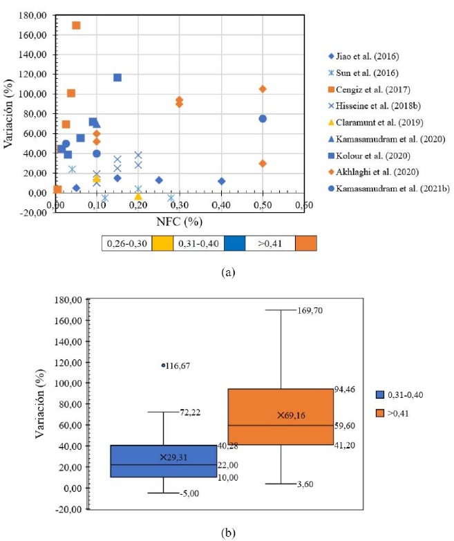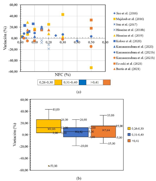 La Figura 4a resume el cambio porcentual en la resistencia a la compresión a los 28 días en función del porcentaje de adición de NFC. Es importante señalar que solo se consideraron los estudios que proporcionaron datos. Cuando se clasifican los resultados de variación por la relación a/c (Figura 4b), se observa que a menor relación a/c, mayor porcentaje de variación positiva, 9,80% para una relación a/c de 0,26 a 0,30, presentando un solo dato atípico. Adicionalmente, se observa que, para esta relación a/c, solo existen porcentajes positivos y una menor dispersión de los datos (3-43%). Para las demás relaciones a/c, la dispersión de los datos es mayor y se presentan valores de reducción de la resistencia a la compresión.