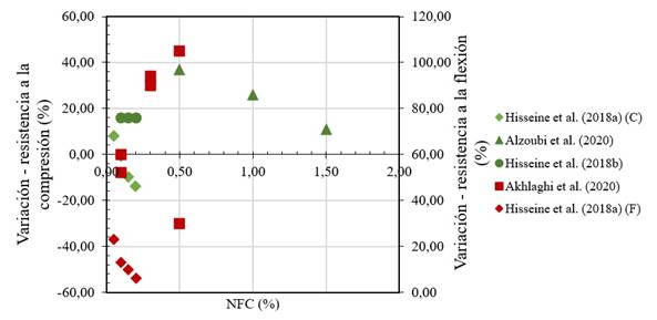 Finalmente, la Figura 6 resume todos los resultados reportados en la literatura tanto para la resistencia a la compresión (verde) como a la flexión (rojo) de concretos y morteros, mostrando efectos positivos de la adición de NFC, principalmente para la resistencia a la flexión.