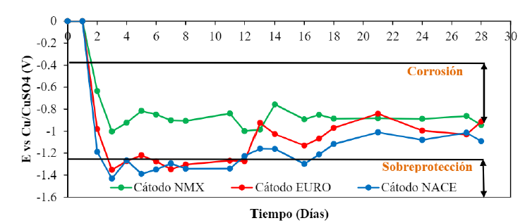Se observa que con la aplicación de la norma NMX-C-553-ONNCCE-2018 no se llega a la región de sobreprotección, por lo cual no representa riesgo de producir hidrógeno y fragilidad en el acero. Para la norma europea (UNE-EN-1504), la polarizacion alcanza hasta el intervalo de sobreprotección durante los primeros 12 días, posteriormente incrementa sus valores de potencial fuera de la zona de riesgo de fragilidad por hidrógeno. En estos casos, es conveniente llevar a cabo ensayos de tensión para corroborar si el acero fue afectado por la generación de hidrógeno. Es particularmente importante considerarlo en concretos con acero postensado o pretensado.